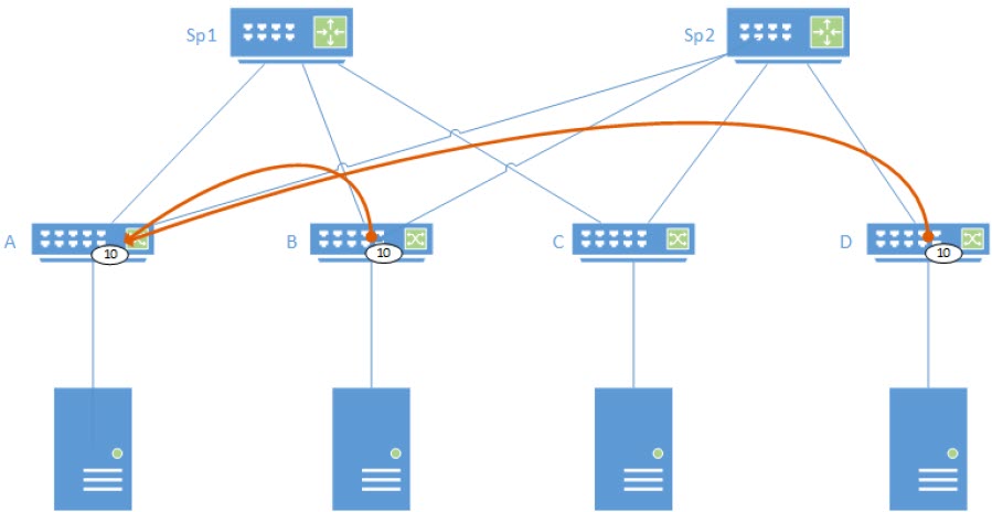 The following figure shows an overview of unicast VXLAN tunnel establishment. Each leaf creates a tunnel with node A after receiving the IMET route. Eventually, a full mesh of tunnels from each of the nodes participating in VLAN 10, using the same VNI are established.