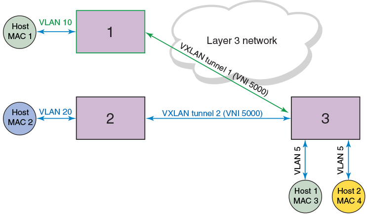 VLANs on each node are extended through common Virtual Network Instance (VNI) 5000. The MAC addresses of local hosts are learned on access points, and MAC addresses are learned on VXLAN tunnels. A split-horizon topology is supported. All nodes participating in the VLAN must be connected through VXLAN tunnels, because there is no tunnel-to-tunnel flooding of broadcast, unknown unicast, and multicast (BUM) traffic.